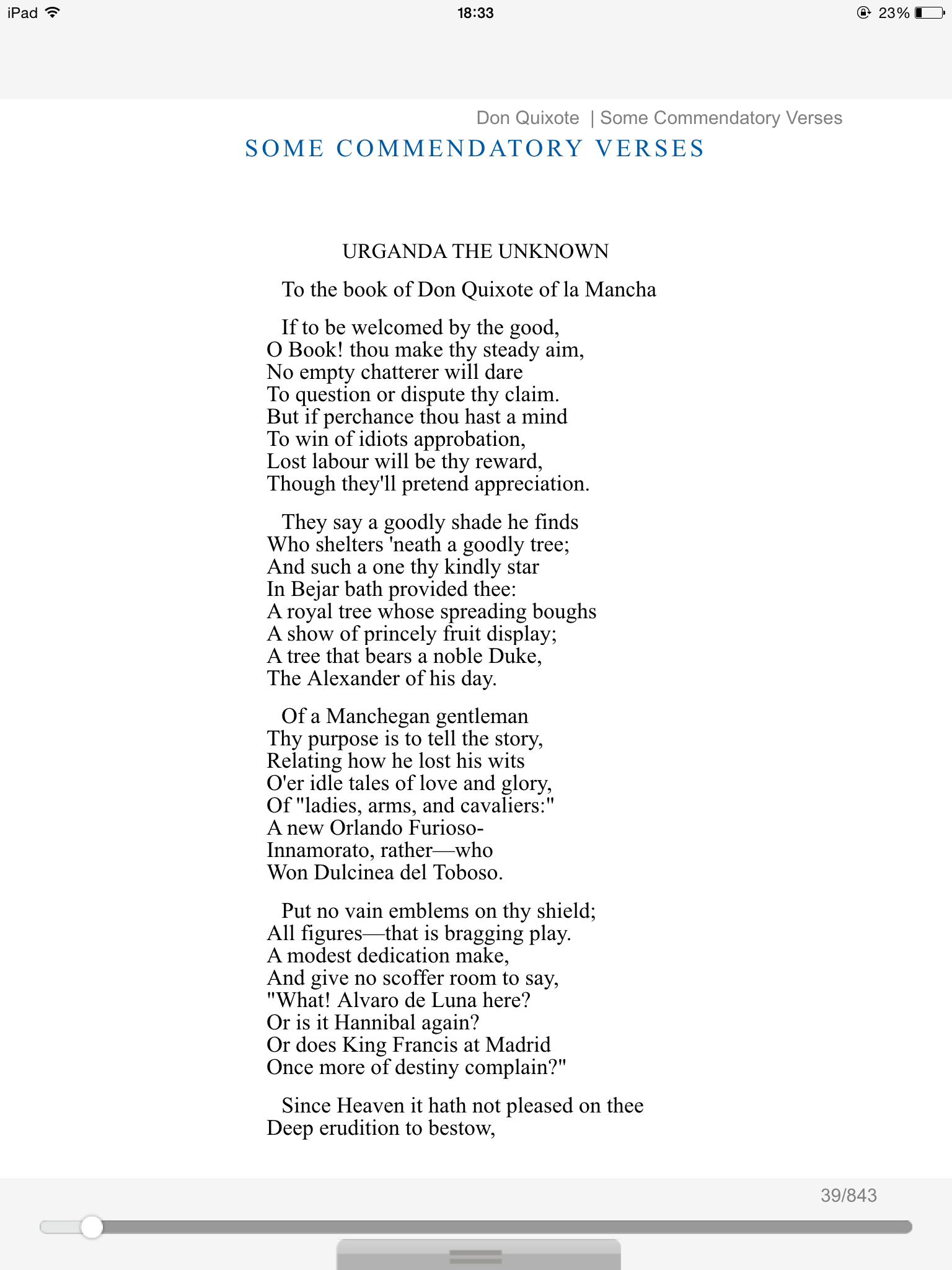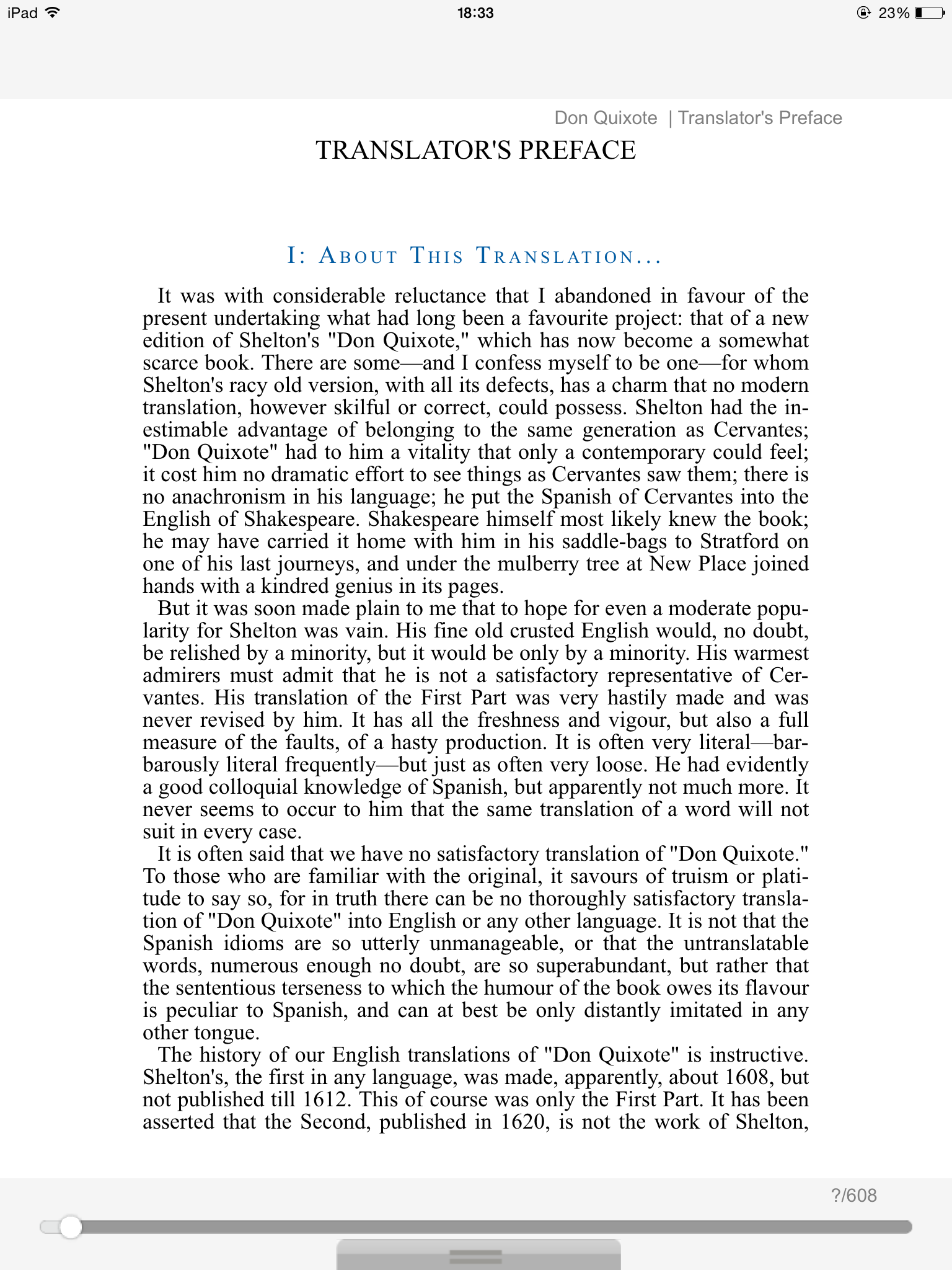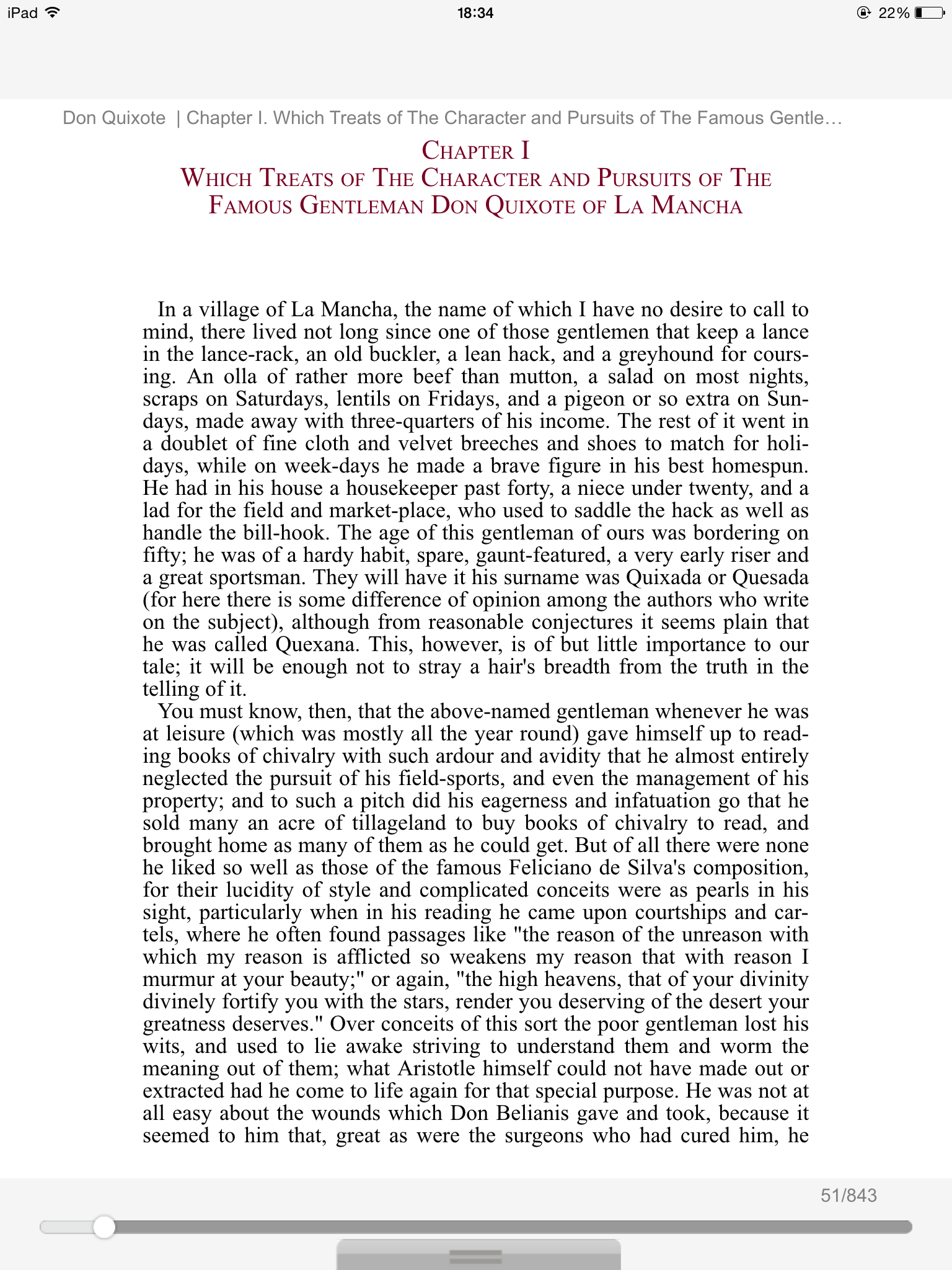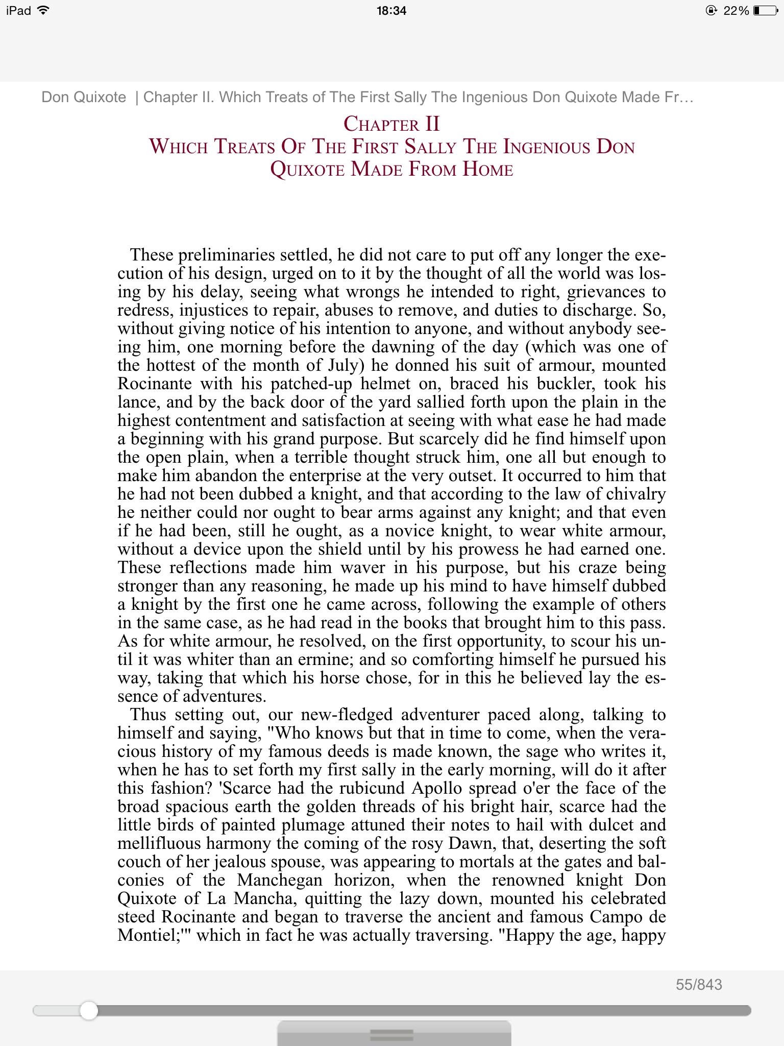 This book is a very nuanced look at escapism and identity, a wonderful parody of knight stories, along with being a rousing (and very funny) adventure centering around the titular hero, a man who reads one too many books about knighthood and chivalry and decides to become a knight-errant himself. After recruiting a sidekick and choosing a lady to woo per narrative convention, he sets out to conquer the forces of evil, which include, among other things, giant windmills and rogue "knights". Cervantes' insight and ability to parody were both ahead of his time, and in a time where escapism and voyeurism are well and thriving, it is not difficult to imagine someone watching too many TV shows and believing they're a wild west outlaw or what-have-you. A very fascinating experience, and it works well in any language. Highly recommended.