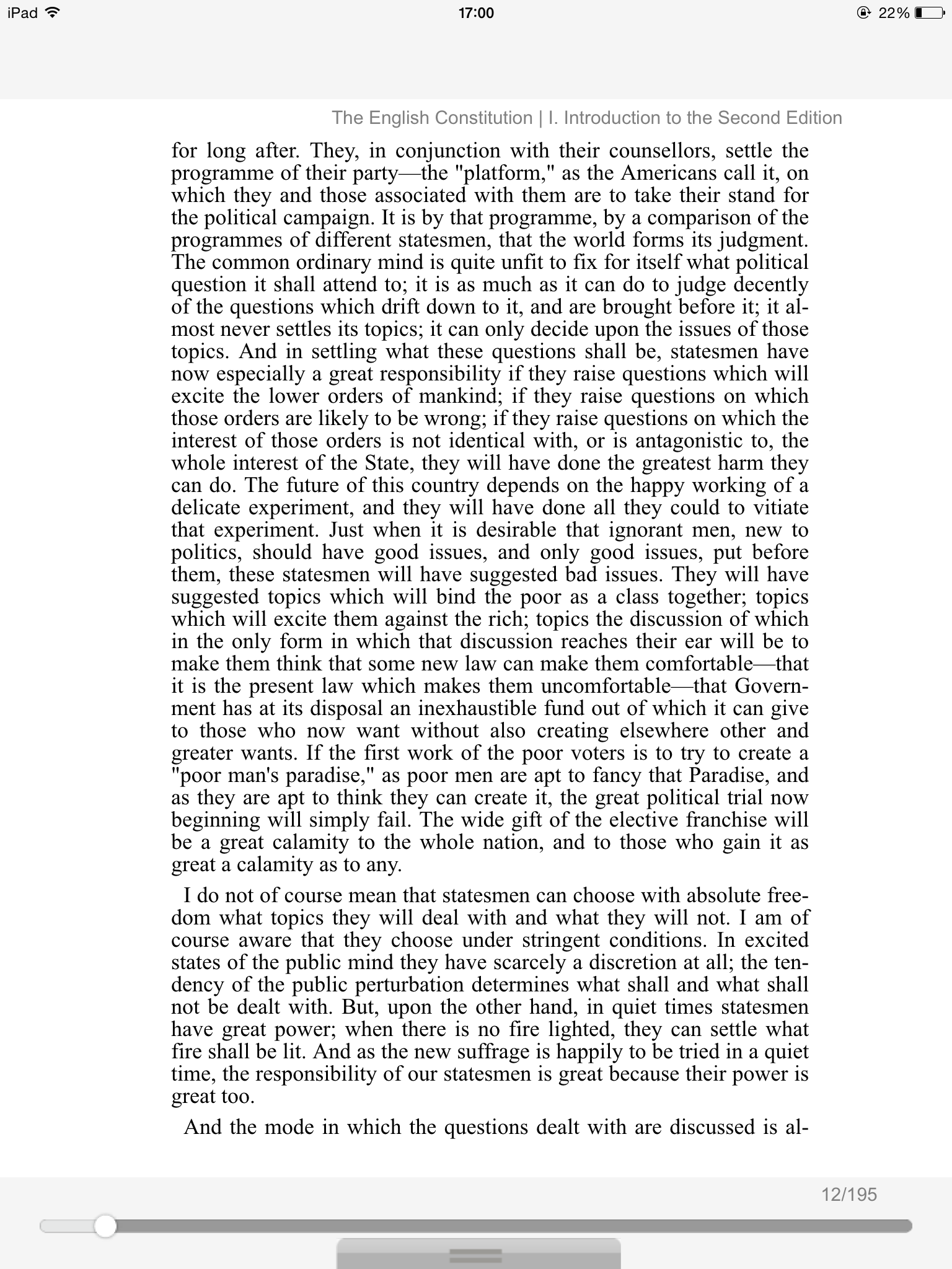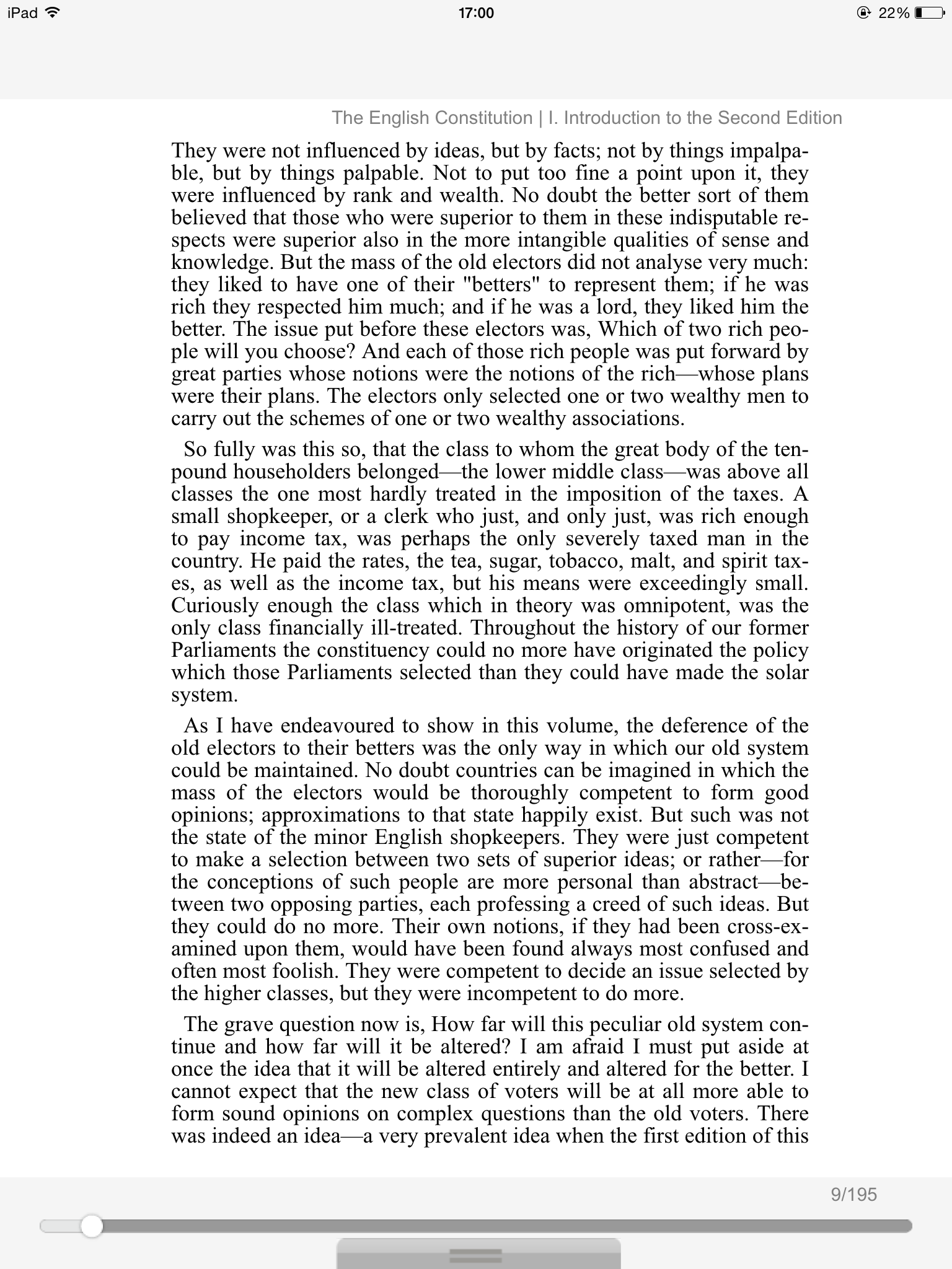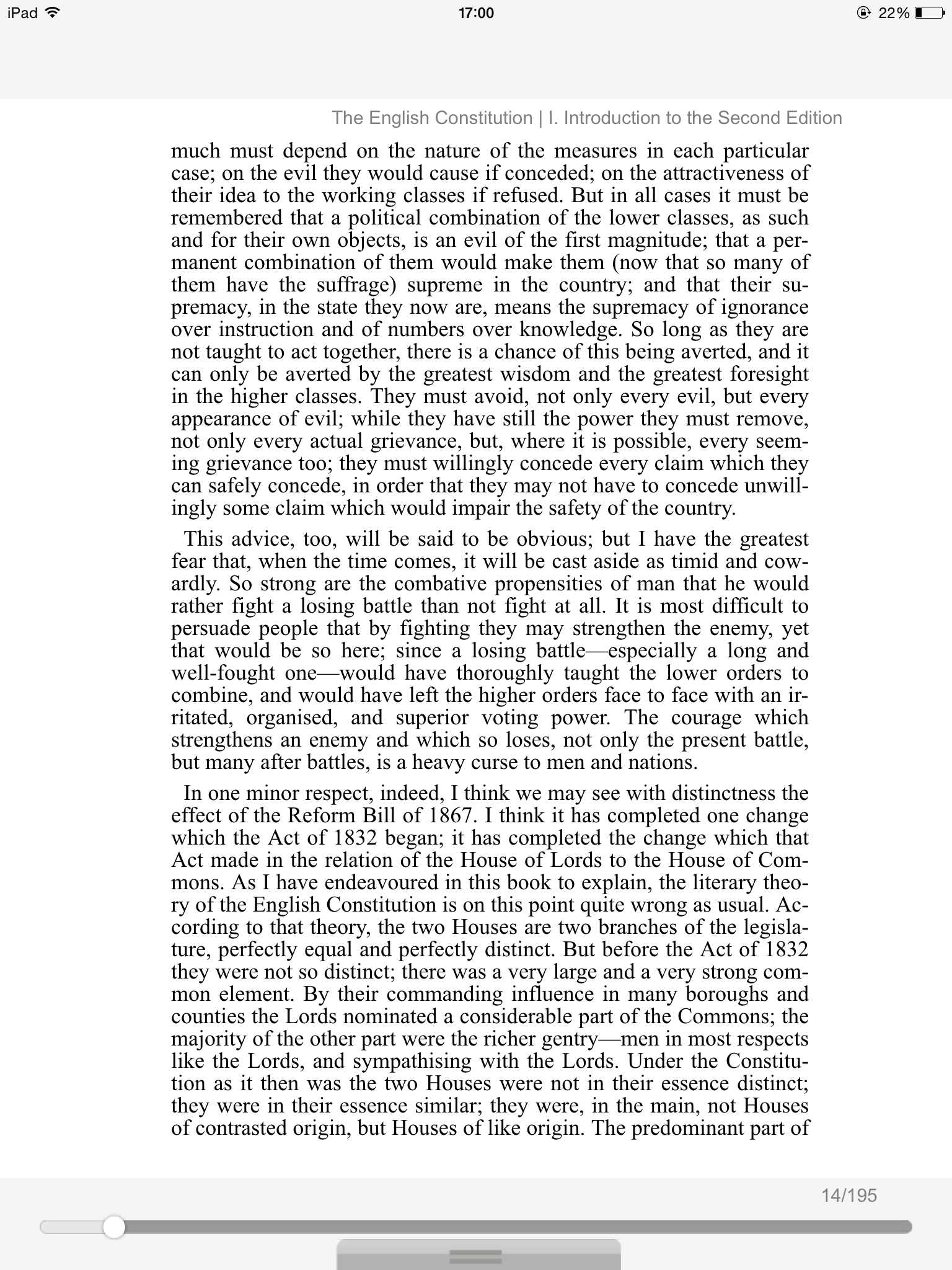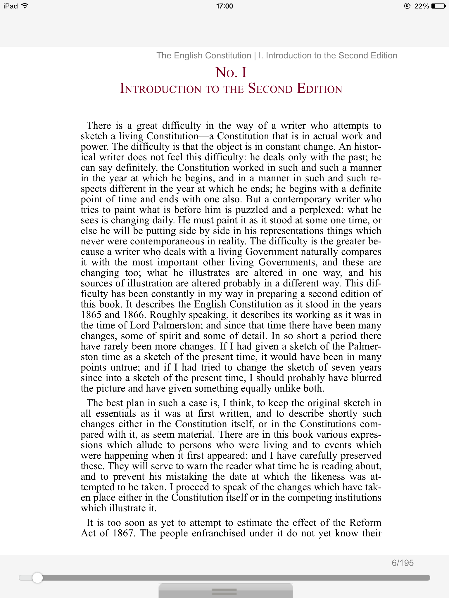There is a great difficulty in the way of a writer who attempts to sketch a living Constitution—a Constitution that is in actual work and power. The difficulty is that the object is in constant change. An historical writer does not feel this difficulty: he deals only with the past; he can say definitely, the Constitution worked in such and such a manner in the year at which he begins, and in a manner in such and such respects different in the year at which he ends; he begins with a definite point of time and ends with one also. But a contemporary writer who tries to paint what is before him is puzzled and a perplexed: what he sees is changing daily. He must paint it as it stood at some one time, or else he will be putting side by side in his representations things which never were contemporaneous in reality. The difficulty is the greater because a writer who deals with a living Government naturally compares it with the most important other living Governments, and these are changing too; what he illustrates are altered in one way, and his sources of illustration are altered probably in a different way. This difficulty has been constantly in my way in preparing a second edition of this book. It describes the English Constitution as it stood in the years 1865 and 1866. Roughly speaking, it describes its working as it was in the time of Lord Palmerston; and since that time there have been many changes, some of spirit and some of detail. In so short a period there have rarely been more changes. If I had given a sketch of the Palmerston time as a sketch of the present time, it would have been in many points untrue; and if I had tried to change the sketch of seven years since into a sketch of the present time, I should probably have blurred the picture and have given something equally unlike both.