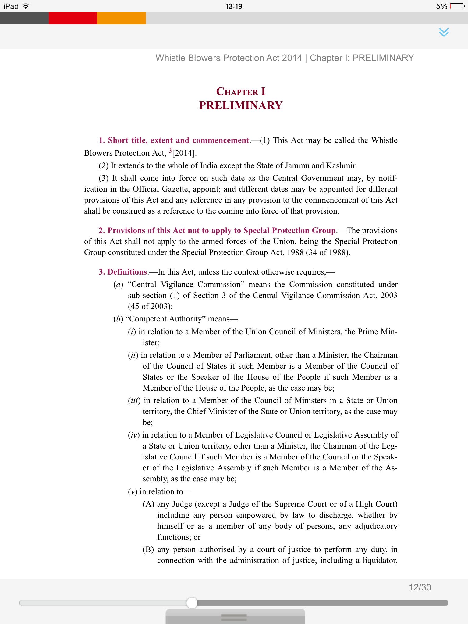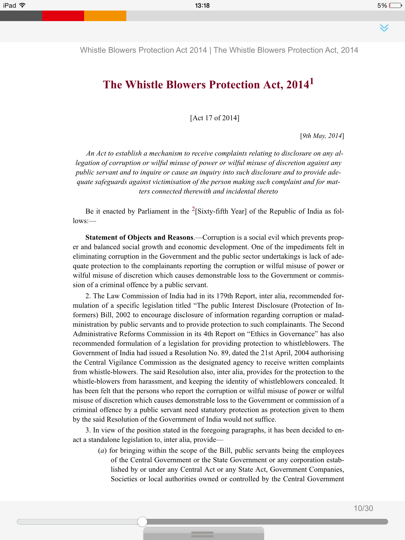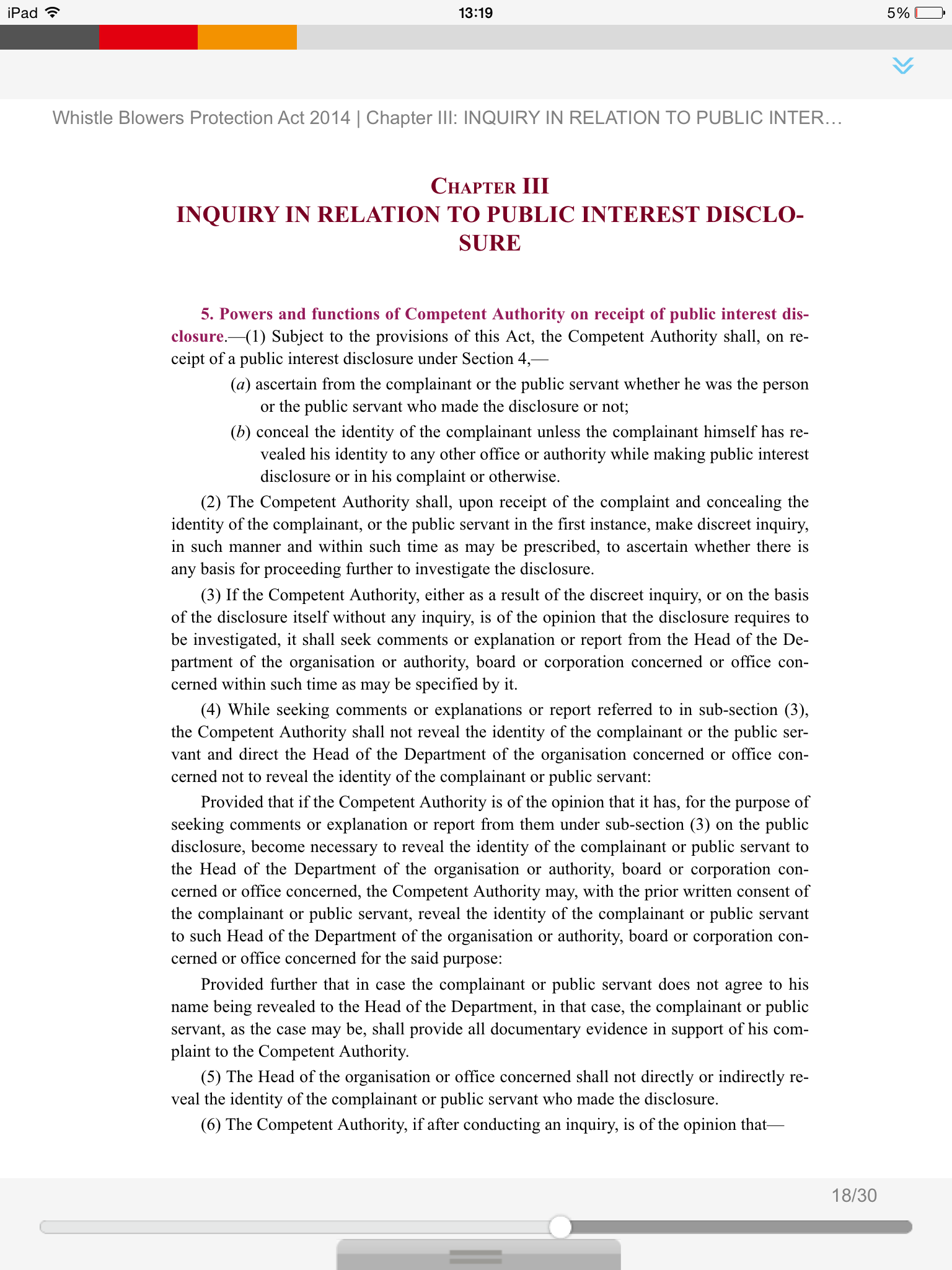 The Act provides a mechanism for receiving and inquiring into public interest disclosures against acts of corruption, wilful misuse of power or discretion, or criminal offences by public servants.